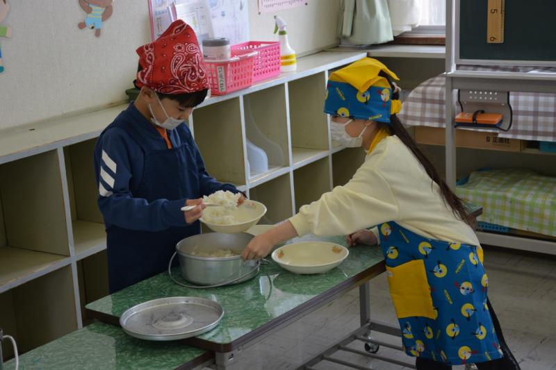 最初のメニューはカレーライス。2年生が盛り付けをしてくれました。子供たちはとてもうれしそうに初めての給食を味わっていました。これから毎日が楽しみですね。