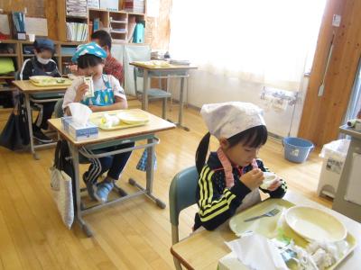 今日の給食はクリームスパゲティとはちみつレモンゼリー。子供たちはおいしそうに笑顔で食べていました。