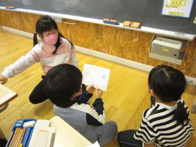3年生外国語活動の1場面です。一人一人カードを作るのためにそのカードに必要ないろいろなかたちの図形をもらいにALTの前に行き、英語で欲しいカードを話しているところです。さらにALTからは、「何枚必要か」の質問があり、子供たちはその質問にも英語で答えています。みんな堂々と会話しています。