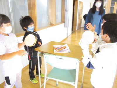 1年生が音楽の時間にいろいろなリズムをうつ学習をしました。2つのグループに分かれ、片方のグループがうったリズムをもう1つのグループがまねしながら打っています。