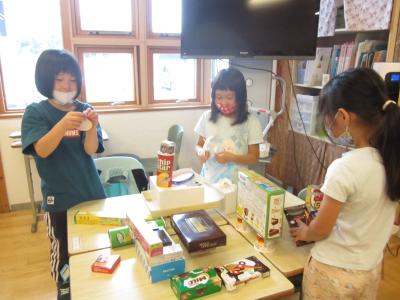 1年生の算数では、いろいろなかたちの箱や筒をつかって、グループで話合いながら公園や家など思い思いのものを作っていました。